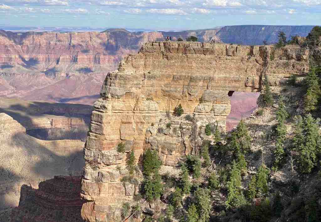 Nous débutons notre visite, après un pique-nique rapide, par une marche autour de Bright Angel Point qui domine le Canyon et nous permet d’apercevoir, près de 1500 mètres plus bas, le célèbre Phantom Ranch (là où font escale nocturne les vrais marcheurs, ceux qui osent traverser le Canyon d’une rive à l’autre). De magnifiques vues sur cette incroyable Canyon agrémentent une marche tranquille. Puis nous reprenons la voiture pour aller sur d’autres sites, tous plus beaux les uns que les autres (comme disait ma grand-mère maternelle). Cape Royale est distant d’une vingtaine de miles. La route est vraiment tout au bord du précipice du Canyon, et propose des panoramas extraordinaires. Tout au bout, nous faisons halte pour enjamber la Angel Window et il ne faut pas avoir le vertige pour admirer le 360 qui s’offre à nous. La Colorado river est tout en bas, comme un serpentin vert qui se détourne de notre regard.