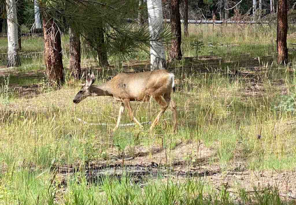 Plus loin les Vermillon Cliffs nous accompagnent sur notre droite de leurs imposantes et rougissantes silhouettes. Plaisir des yeux garanti tandis que la 89 file vers la forêt de Kaibab. File et monte, car nous gagnons progressivement en altitude (Page est à 1200 m au-dessus du niveau de la mer). Au moment de tourner vers Rim North, nous atteignons 2500 mètres environ, et l’air est délicieusement frais. A peine une vingtaine de degrés ! Première bonne surprise du jour : nous pourrons nous balader sans souffrir de la chaleur. La forêt s’étend sur une soixantaine de kilomètres, et laisse parfois place à quelques prairies bien vertes. Des campements ou des cabines en bois se regroupent par endroits et laisse penser que l’hiver aussi, il y a quelques aventuriers qui se retrouvent au milieu de nulle part. Aucune ville, ni véritable village sur le chemin de l’entrée du parc national du Grand Canyon.