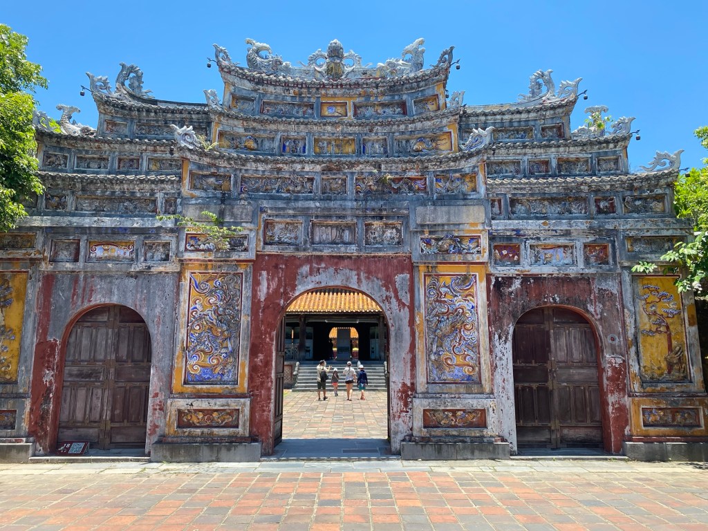 Première surprise, ce carré de 650 mètres de côté, sur le modèle de la cité interdite de Pékin (voir un long voyage précédent de Moscou à Pekin) est assez récent . Deux siècles à peine nous séparent de sa création. Destinée à loger et protéger l’empereur et sa famille, mais aussi sa cour, la cité comprenait à son apogée une petite cinquantaine de bâtiments dont les trois quart ont hélas été victime des B52 américains dans les années 60. Mais certains ont été restaurés magnifiquement et remeublés dans le style d’époque (19eme siècle pour l’essentiel).