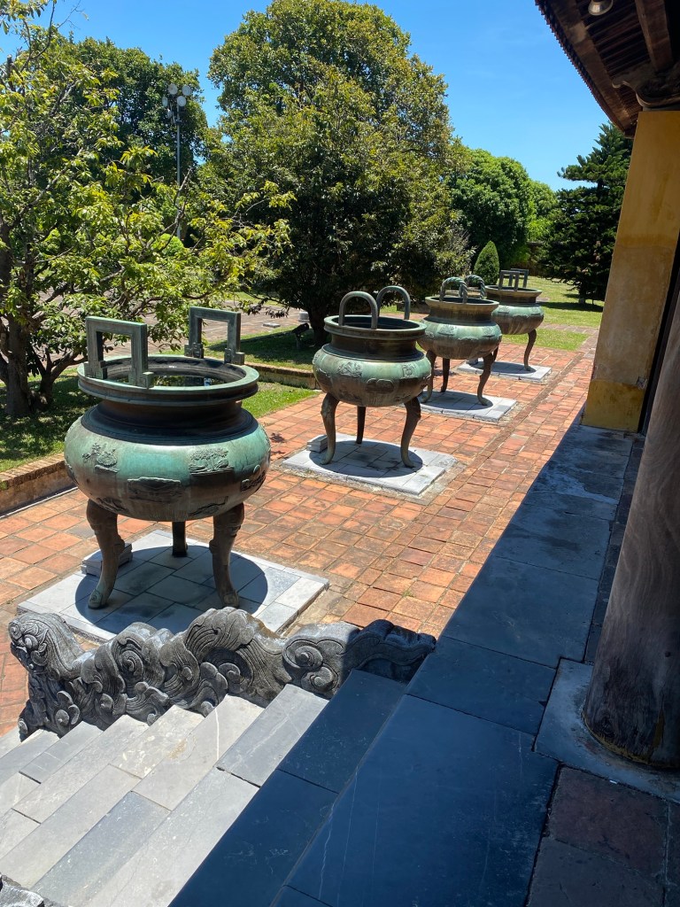 Ainsi dans une cour, on découvre neuf urnes géantes en bronze qui contiennent les cendres et rendent hommage aux empereurs de la lignée Nguyen, au pouvoir jusqu’en 1950, date à laquelle Dao Bao abdiqua sous la pression des communistes. Il continuera à vivre dans la cité plus tard, perpétuant la tradition familiale.